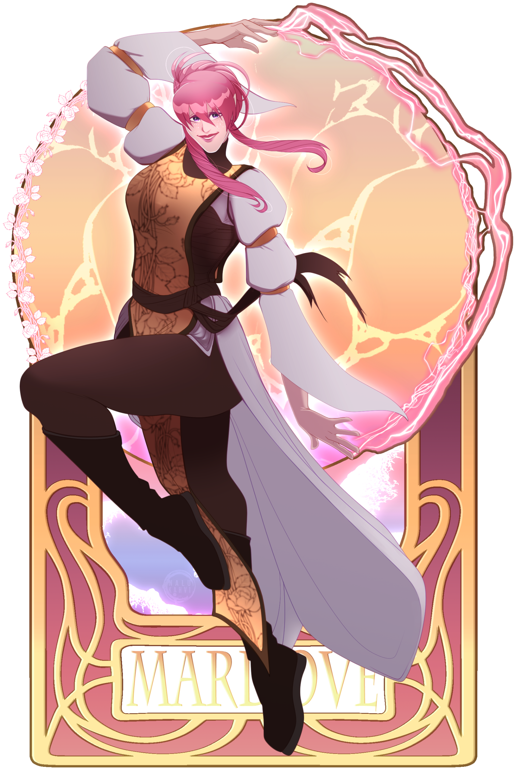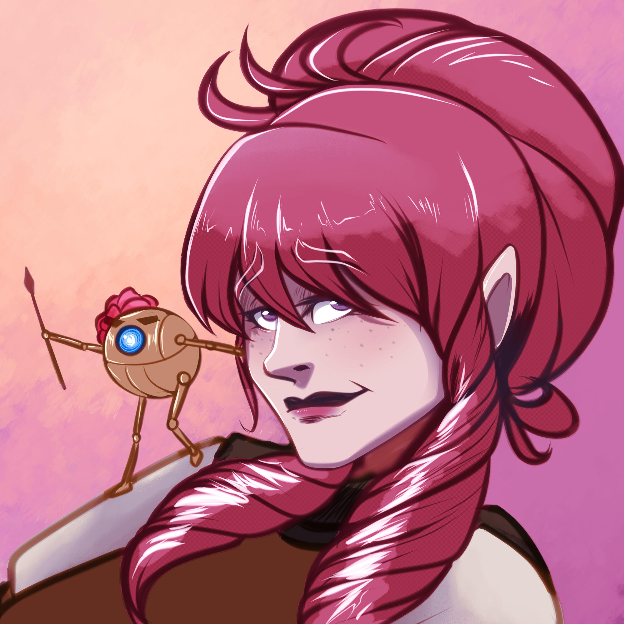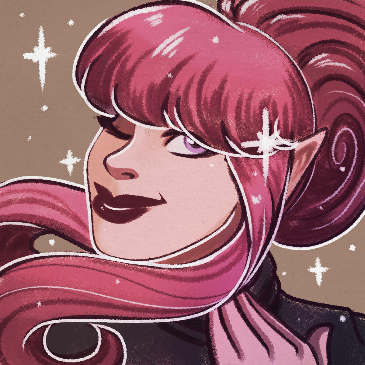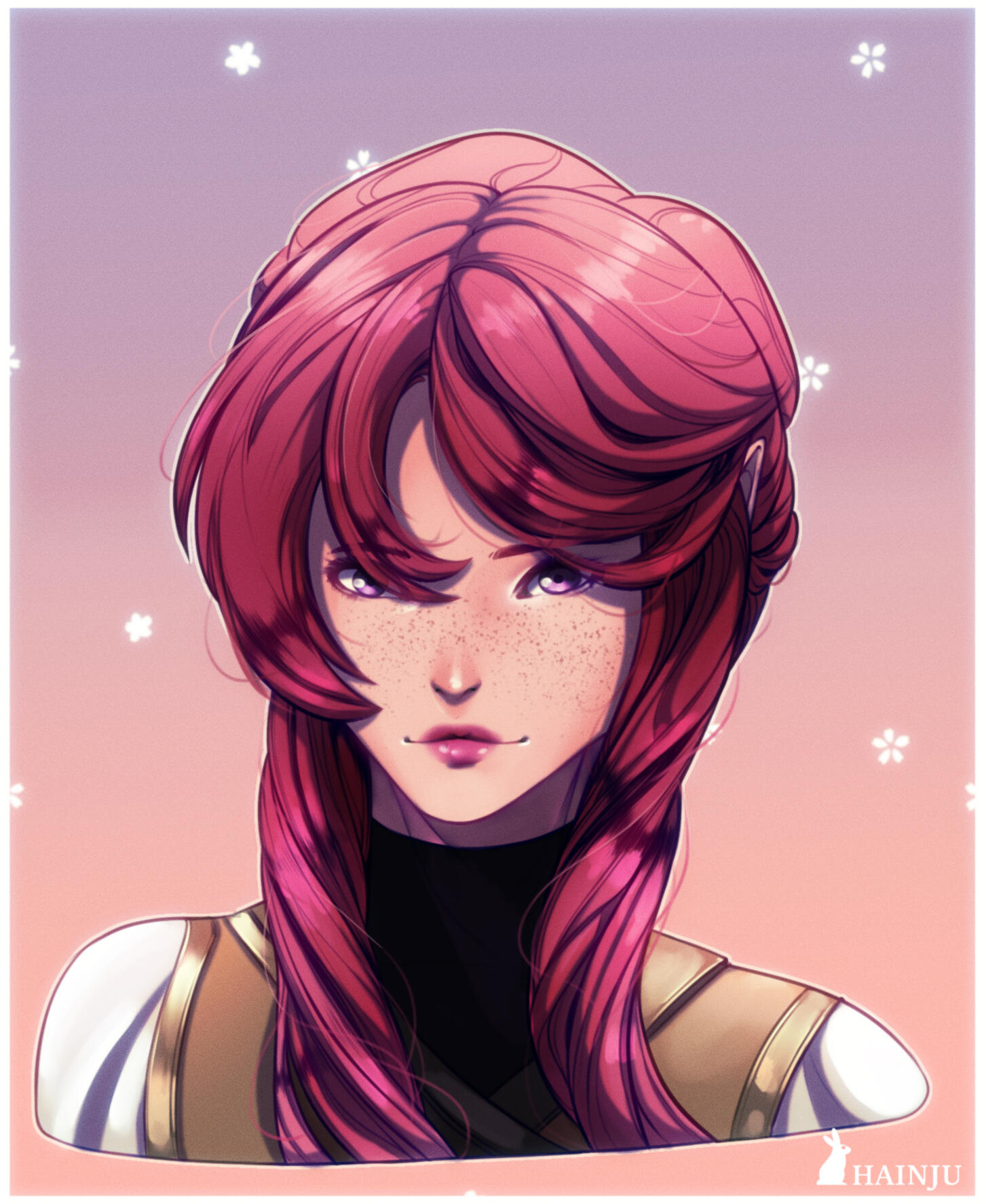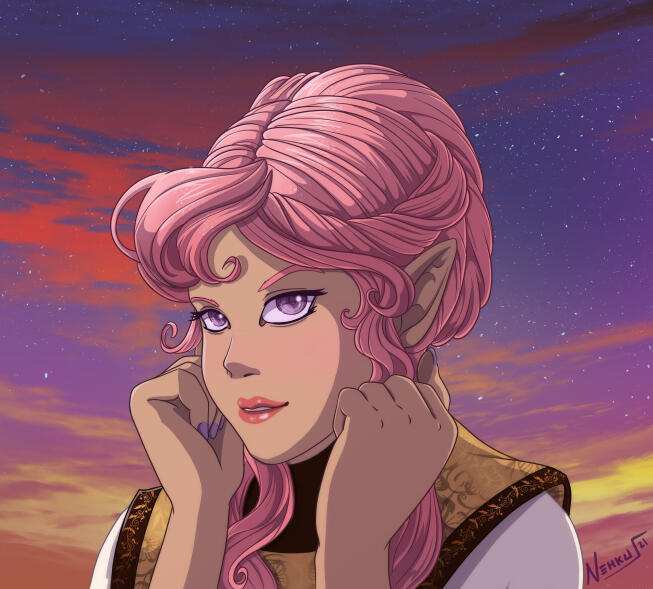 | COLORING | Strawberry Pink & Amethyst | NOTABLE FEATURES | Striking facial features (elven heritage) in direct conflict with lanky frame and posture; freckles across tops of cheek and nose |