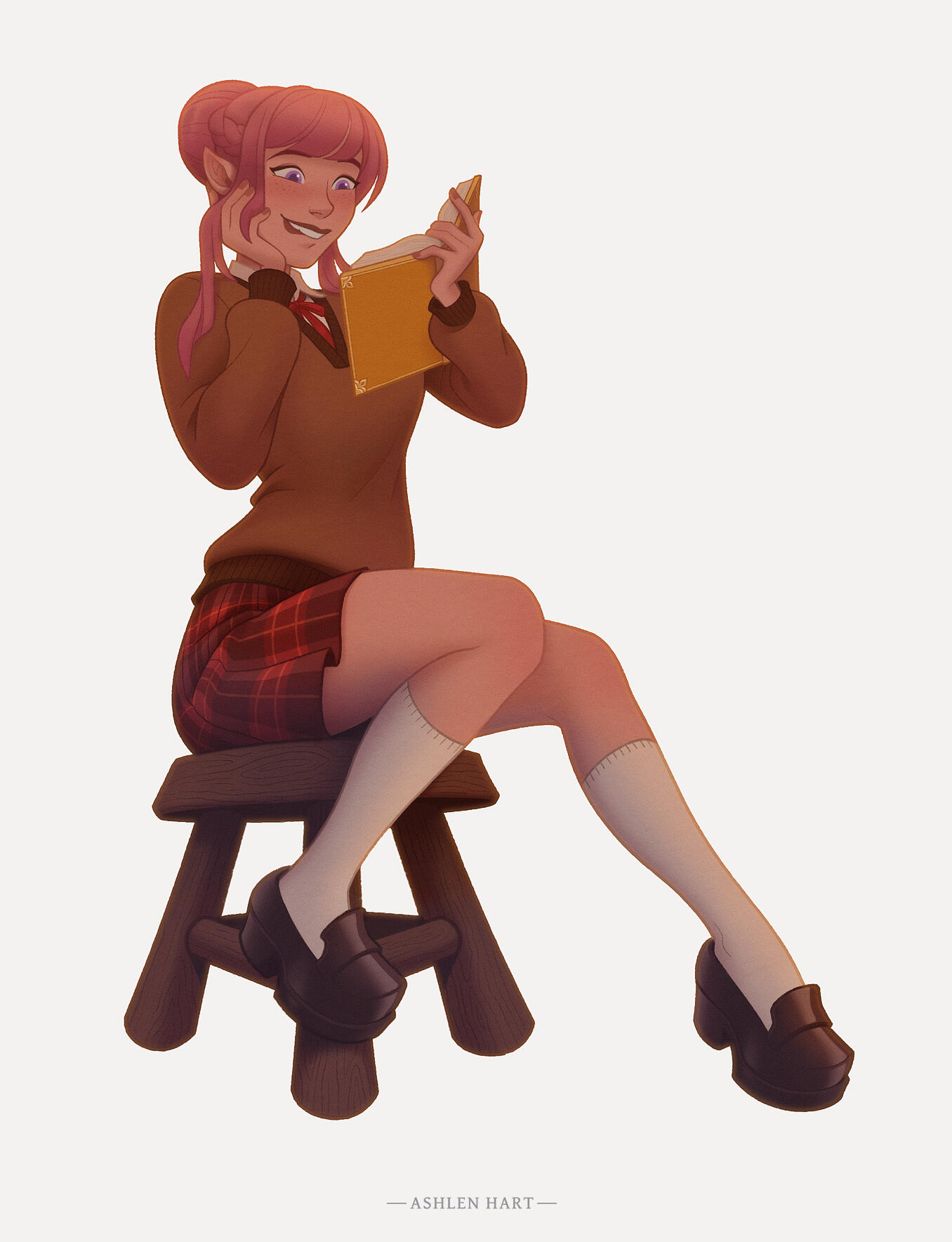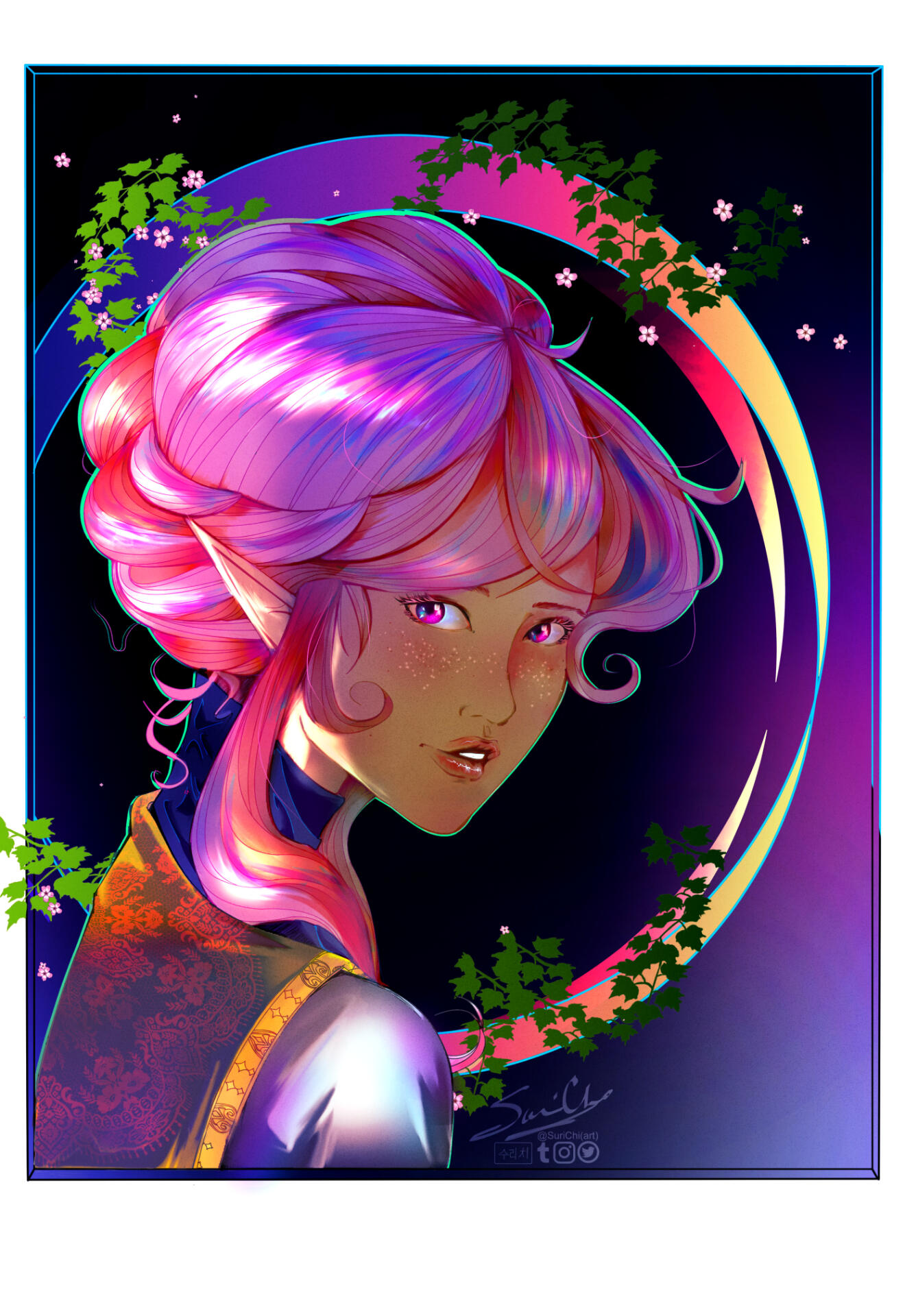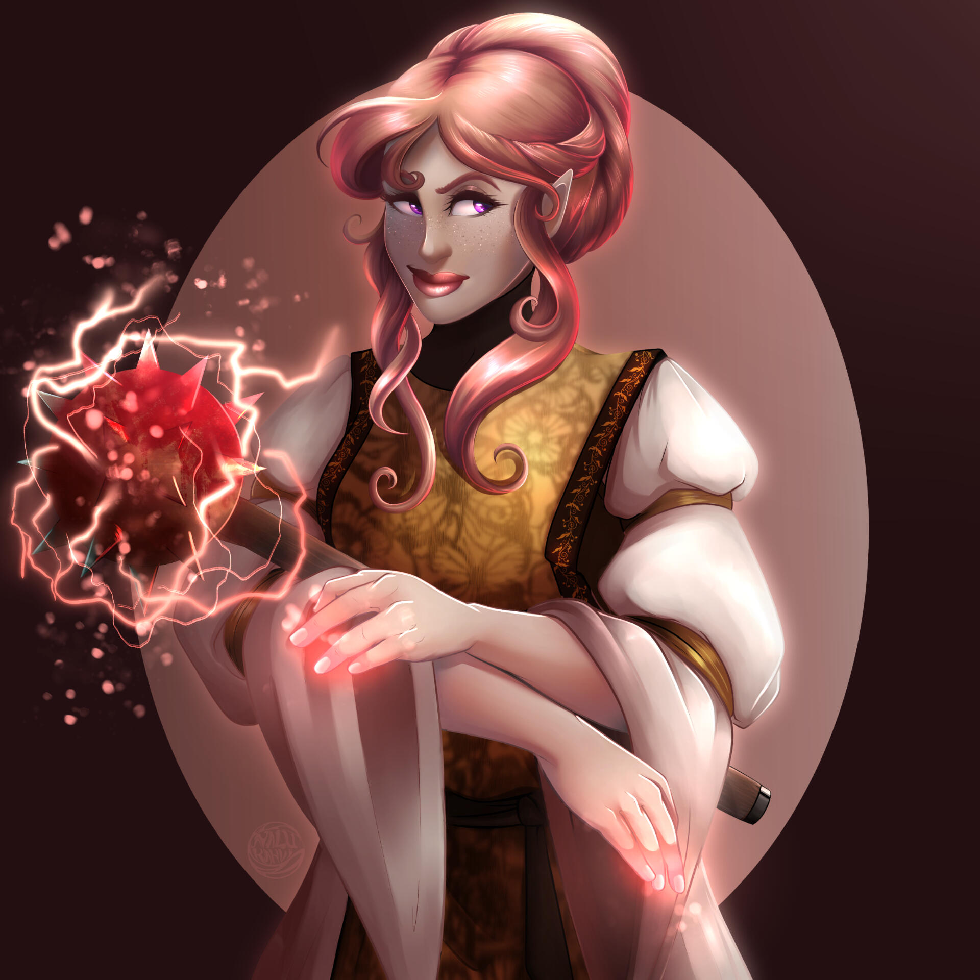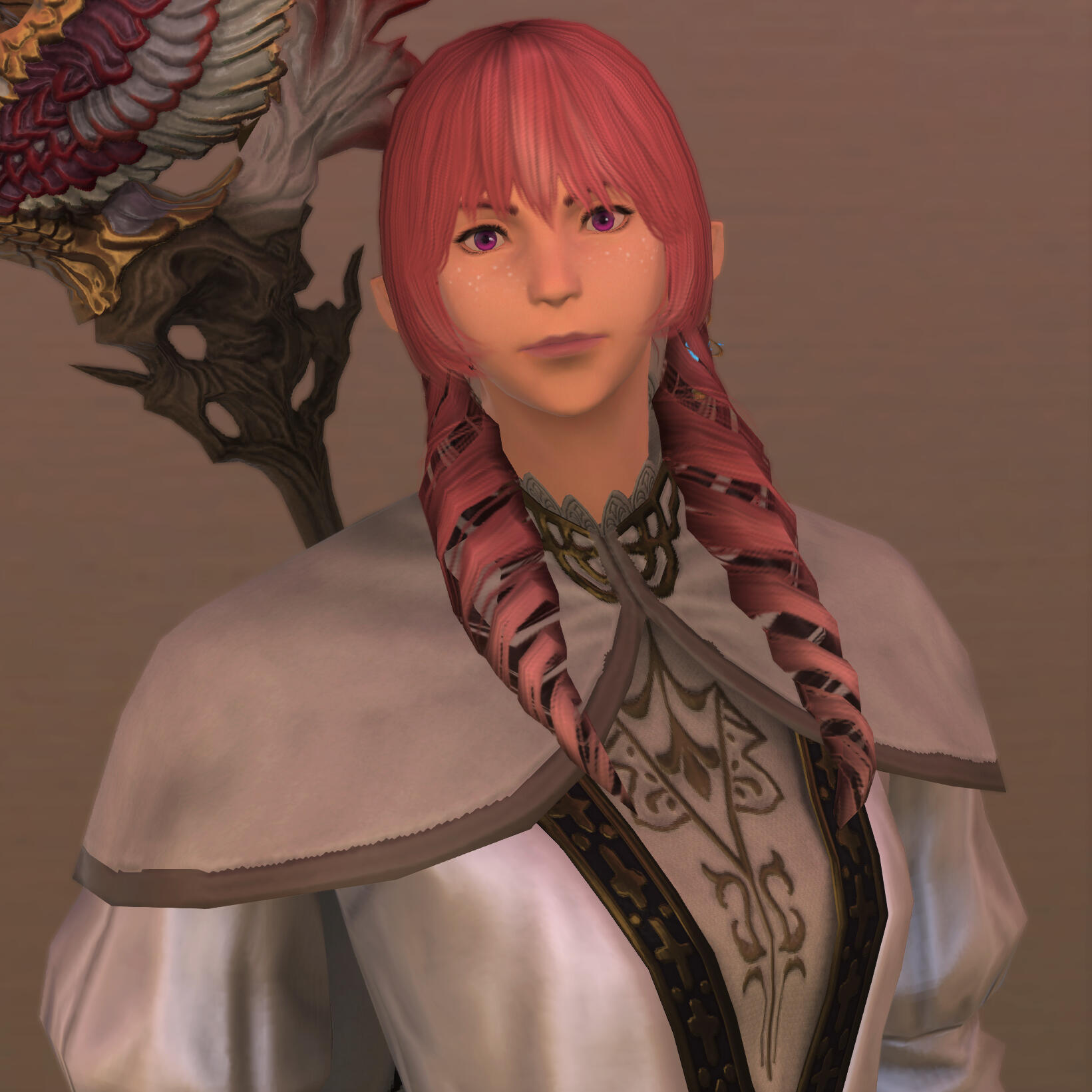 | COLORING | Strawberry Pink & Amethyst | NOTABLE FEATURES | Striking facial features (elven heritage) in direct conflict with lanky frame and posture; freckles across tops of cheek and nose |